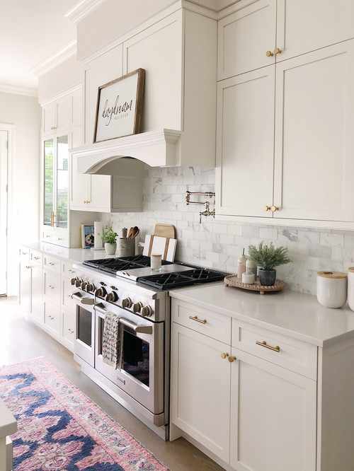 Grey pairs easily with white marble, oak floors, and stainless appliances. For a cohesive look, repeat grey in your backsplash or island cabinet.